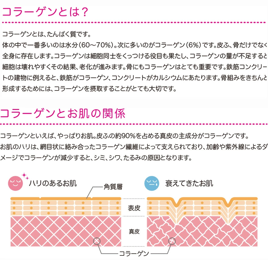 コラーゲンといえば、やっぱりお肌。皮膚の約90%を占める真皮の主成分がコラーゲンです。お肌のハリは網目状に絡み合ったコラーゲン繊維によって支えられており、加齢や紫外線によるダメージでコラーゲンが減少するとシミ、シワ、たるみの原因になります.